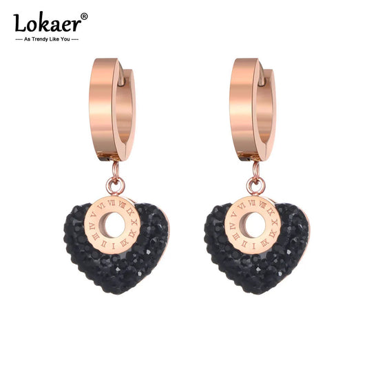 Roman Numerals Titanium Stainless Steel White/Black Clay Crystals Heart Hoop Earrings for Women Boucle D'Oreille E19135